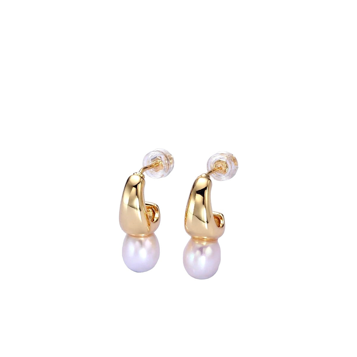 On these gold hoop stud earrings, freshwater oval or round pearls are connected to a hoop creating these unique pieces.