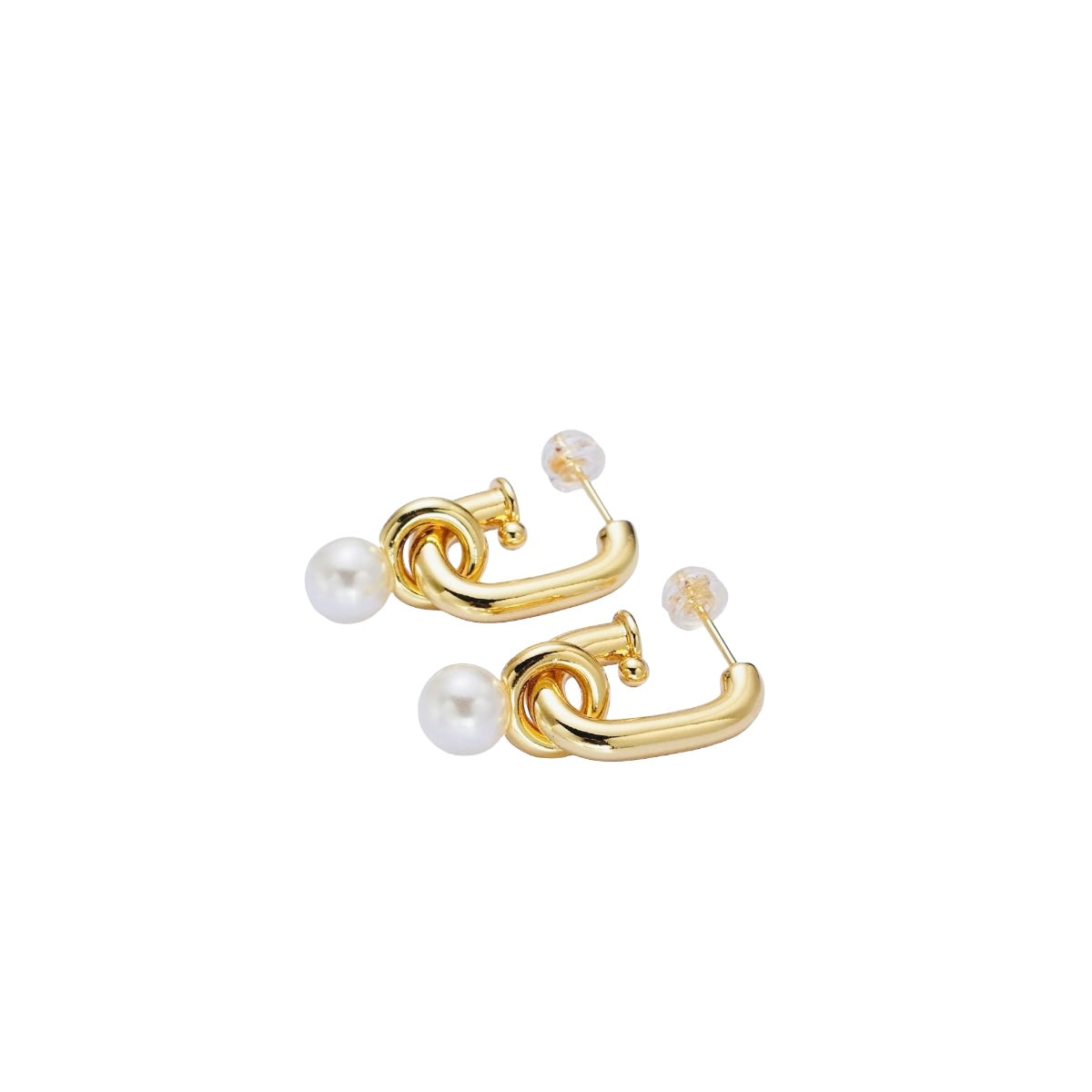 On these gold hoop stud earrings, freshwater round pearl charms are hanging from J-shaped hoops putting an updated spin on pearl hoop earrings.