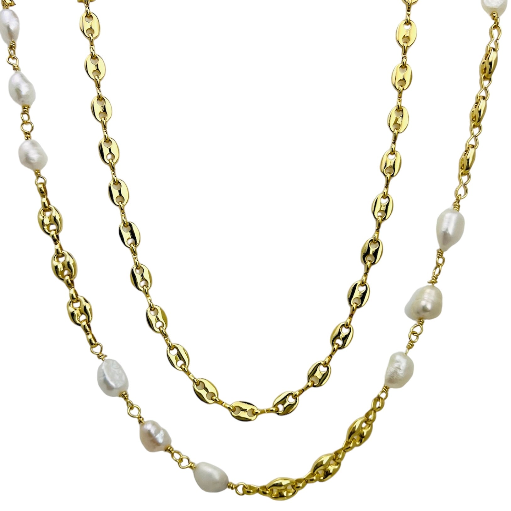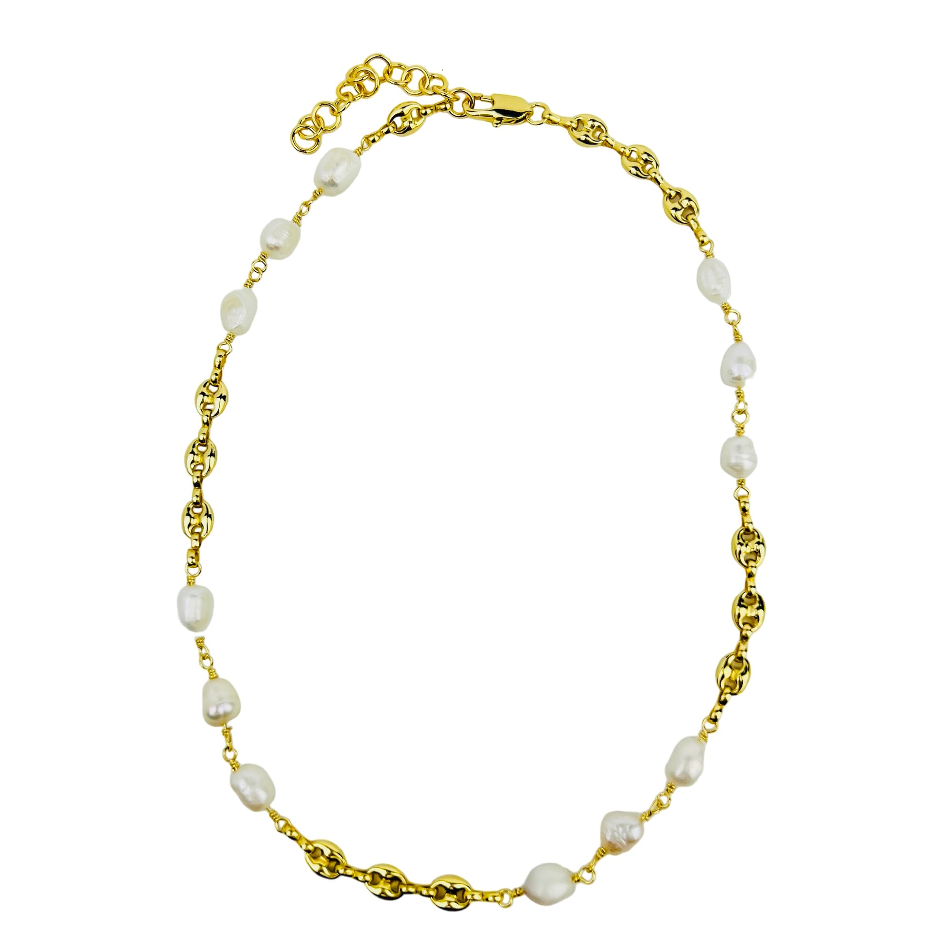 On this gold filled chain necklace, freshwater baroque pearls and mariner links are connected creating this stunning piece.